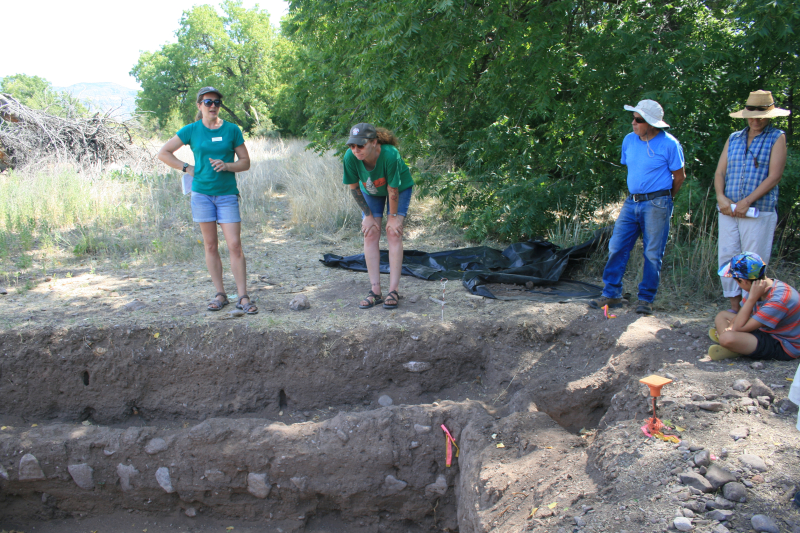 [Photos, L to R:] 1. Here, one partially-excavated room reveals a stone platform typical in Mimbres-Mogollon pueblos for supporting a granary (large covered pottery jar for storing grain). 2. Another room’s wall base shows the Mimbres-Mogollon construction of the era, in which large stones (cemientos) were held together with adobe mud. 3. Leslie Aragon explains to the group the significance of the various layers of soil deposits, and that the crew excavated below floor level to confirm that the pueblo was built on native soil instead of any earlier habitations. 4. In another partially-excavated room, a hearth was found to have contained ashes that disclosed a wealth of information about the occupants’ diet and lifestyle. 5. Moreover, Kayenta-style pottery in the form of perforated plates* were found in this room, indicating that at least two different cultures lived in this pueblo at the same time. In yet another pueblo room – unusually large and elongated – the crew found a fragment of a well-worn metate.