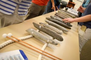 It was not especially unreasonable for archaeologists to first assume that they were an assortment of human-made manos (grinding stones) or some other kind of tool. However, they all seemed unusually large (up to two feet long) and heavy (up to ten pounds), with none of the typical wear patterns of manos. Archaeologist Marilyn Martorano spent over a decade working on the puzzle of what the stones may have been used for, if they were not manos. She recently happened upon an online video of a Paris museum’s collection of similar stones that had been recovered in places as diverse as Africa, New England, Hawai’i, and New Mexico. The video demonstrated that these artifacts were not grinding stones at all, but musical percussion instruments – lithophones. (Click on that link to the video above, to hear the stones for yourself. Recommended!)